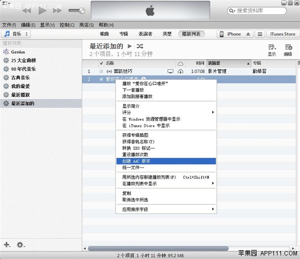 第四步,重新打開該音樂文件的右鍵菜單,點擊“創建AAC版本”。