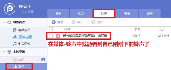 5、下載完畢會後,你可以在PP助手的“媒體”-“鈴聲”中找到自己添加的手機鈴聲。但要注意的是,如果你是來電鈴聲,那麼它就只能作為來電鈴聲,如果是短信鈴聲,那麼它就只能做短信鈴聲,不是說你下一一個鈴聲,來電和短信都可以用這個鈴聲。