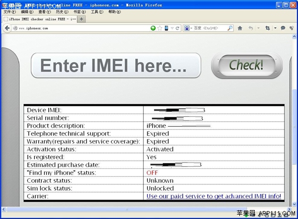 第二步,打開iphoneox.com網站,輸入設備的IMEI,即可顯示出設備的相關信息,倒數第二行就是是否有鎖了。