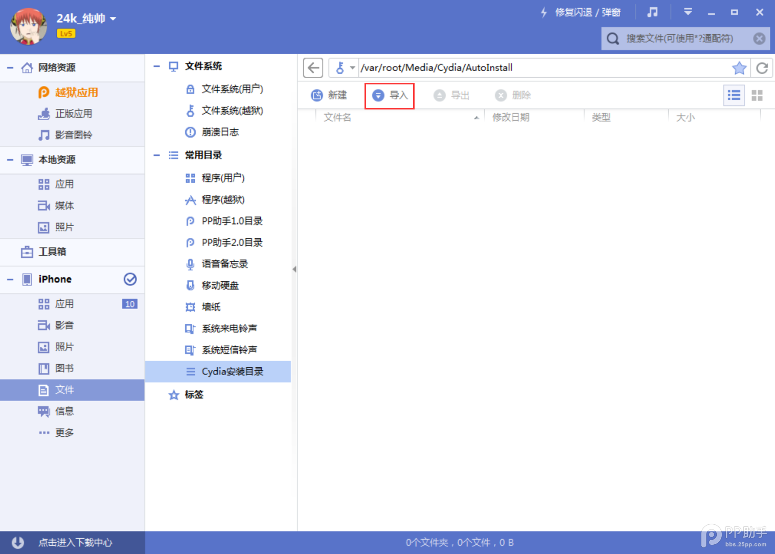 一、電腦上安裝最新版本的PP助手,然後打開【文件】-【cydia安裝目錄】: