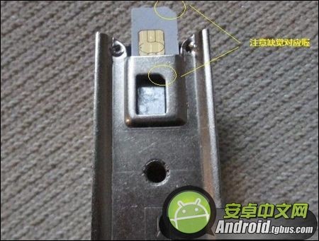1、iPhone 6 Plus剪卡並不麻煩,首先我們需要將SIM大卡安裝在剪卡器底部的卡槽裡邊,如下圖所示,需要注意SIM卡與卡槽的缺覺要對應。