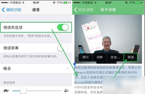 打開朗讀功能後,我們就可以選中一段文字,然後選擇“朗讀”,就可以聽到Siri為我們朗讀了…在地鐵公車上不方便看的時候就可以使用這個功能了。當然你也可以打開“朗讀屏幕”選項,這樣雙指下滑就可以朗讀整個頁面了。