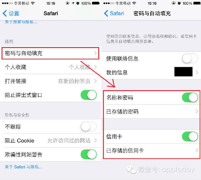 Safari浏覽器的自動填充十分貼心,不過除了自動填充信息外,還能存儲密碼和信用卡信息,總覺得有點不放心啊。當然,進入到設置——Safari——密碼與自動填充,然後關閉相應的選項 就OK了!