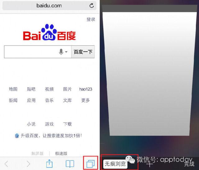 另外必須提到的,Safari浏覽器也有提供了一個無痕浏覽模式。在這個模式下,浏覽網頁時是禁止自動填充和阻止使用cookies,浏覽歷史也不會被保存。點擊Safari右下角的卡片圖標,然後看到左下角的一個無痕浏覽按鈕,點擊一下就好了 !