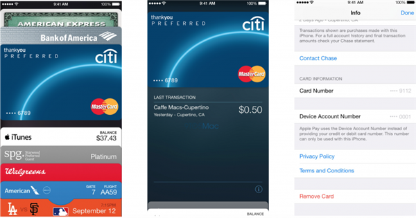 有趣的是,在 Passbook & Apple Pay 設置頁面中,相關銀行和信用卡公司會顯示深一步信息。每一張綁定的卡,用戶都可以看到最近的交易記錄,到 iTunes 應用商店的快捷方式,去下載銀行和信用卡公司的伴侶應用,以及聯絡發卡銀行,還可以收到推送通知,和顯示信用卡號碼和 "獨一設備賬戶號碼 (unique device account number)"。