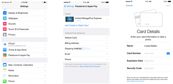 根據蘋果內部培訓材料,Apple Pay 可以通過 Passbook 來設置,具體位置是初次設置 iOS 8 的時候,或者在 "設置" 裡的新標簽頁 "Passbook & Apple Pay",此前 iOS 8.1 已經曝光了一些圖片。通過 iPhone 的攝像頭,用戶可以掃描信用卡,將信息加入到 Passbook 裡面。也可以用和 iTunes 賬戶綁定的信用卡。根據蘋果內部培訓材料,Passbook 最多只能存儲 8 張信用卡/借記卡。