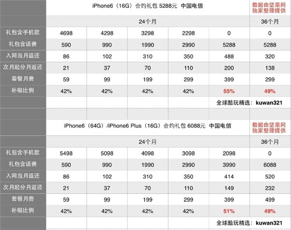 對於電信版本來說,電信推出了iPhone 6和iPhone 6 Plus合約套餐包,合約價分別是5288元和6088元起,合約計劃24個月起,399元套餐享0元購iPhone 6的優惠,iPhone 6 Plus則是499元套餐兩年可享受0元購iPhone 6 Plus的優惠。補貼力度比去年的5s和5c高,從42%到55%不等。