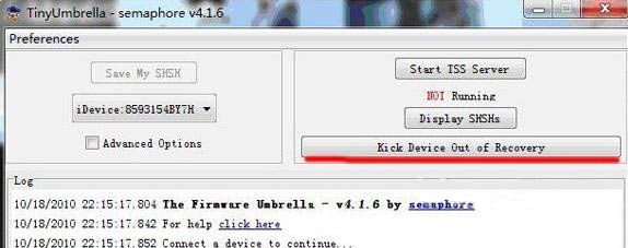 打開TinyUmbrella,出現如下界面時,點擊“Kick Device out of recovery”。