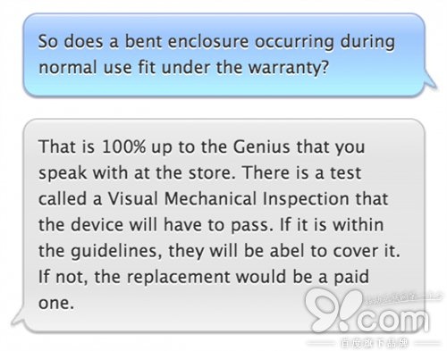 而當thenextweb詢問具體的規定時,蘋果售後代表表示,公司並沒有向他們提供這方面的信息。另外,該名代表表示,希望thenextweb能夠提供更加詳細的信息,並將這一問題反映給更高一級的售後顧問。不難看出,蘋果方面現在對這一問題還是相當重視的。