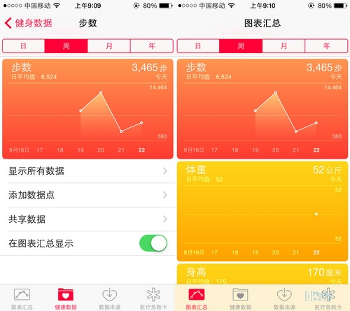 最後一點,“健康”應用中的一些相關項目需要特定的配件達成,但使用iPhone5s的用戶可以發現“健康”應用中的計步器已經開始運行,這是因為其搭載的協處理器M7在運作的緣故。
