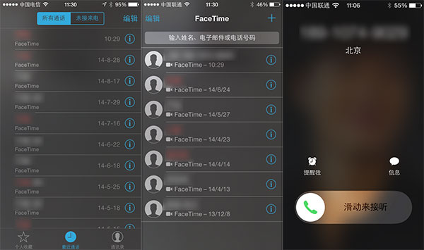 新增了來電歸屬地,Facetime的列表重新改換了版式。(左一為iOS 7,中間和右側為iOS 8)