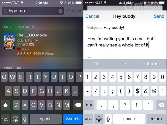 此外在很多其他情況下,3.5吋屏幕也會明顯顯得不夠用,比如在使用 spotlight 搜索時,屏幕上剩余的空間只能顯示一個結果。在編輯郵件時,最多只能顯示3行文字。看通知中心時,也往往無法完整顯示兩條通知,這些都給體驗上帶來了問題。