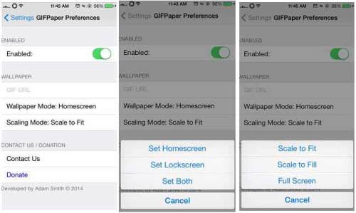 安裝完成後,依次進入【設置】→【GIFPaper】進行相關設定。點擊【Enabled】開啟開關,然後選擇需要設置為主屏或是鎖屏,同時你也可進行縮
