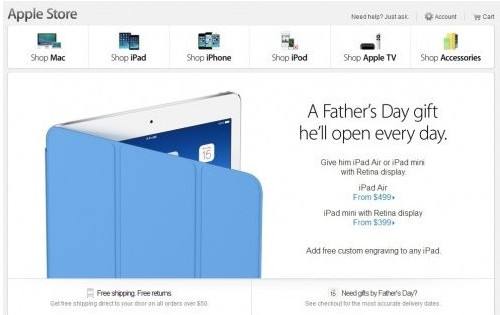 這些年來,蘋果中國官方網站出現了不少獨創的“蘋果體”翻譯。比如之前的母親節、父親節營銷等,均為十分別扭的翻譯,如蘋果中國將英文網的“A gift mom will love opening. Again and Again.” 翻譯成了“讓媽媽開心的禮物,開了又開。”對此,引得網友紛紛吐槽。(下圖為父親節營銷廣告)。