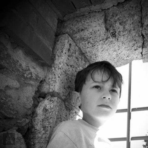 在上圖中,由於強烈的光穿過拱門,男孩子的側面和石雕窗顯得略為暗淡。我們把曝光點設在男孩子的側面,盡管窗外的天空因為曝光過度顯得有點發白,但是依然沒有破壞照片的整體感覺。