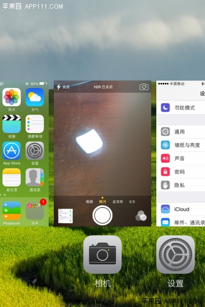 第三步,在多任務管理界面,向左或向右滑動界面,將相機應用調至中間位置。