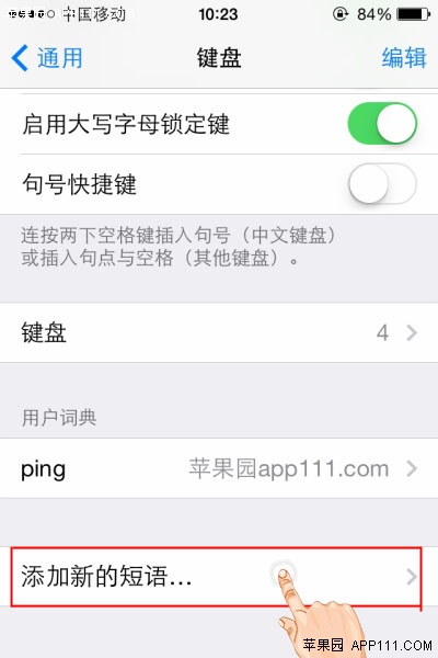 第三步,在鍵盤設置頁面,點擊最下方的“添加新的短語”。