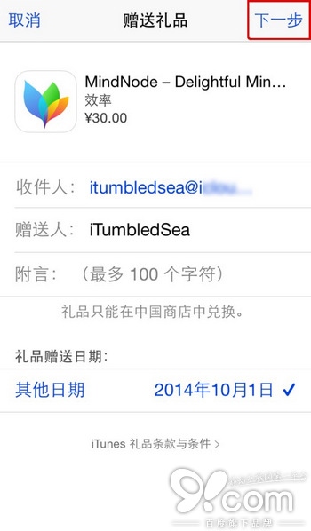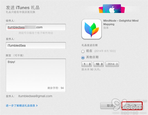 第五步:在接下來的「發送 iTunes 禮品」窗口中輸入收件人的電子郵件地址(你可以將一個應用程序同時贈送給多個收件人,每個收件人將計費一次),接著輸入「發件人」信息,填寫「附言」以及選擇發送禮品的日期。