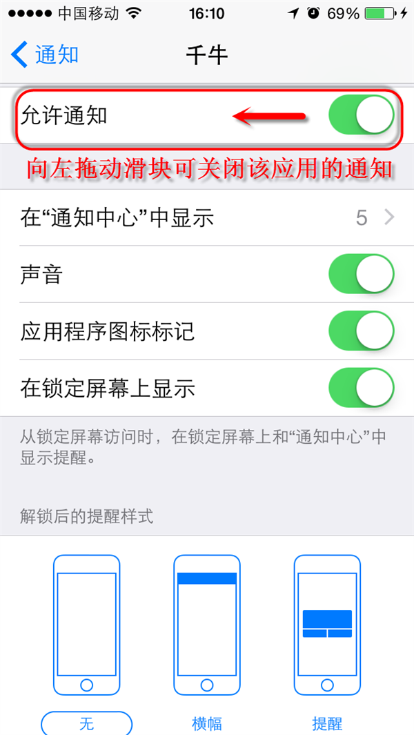 步驟2:向左拖動最上方“允許通知”的滑塊,就可以關閉通知。也可以重新設置解鎖後的提醒樣式,這樣就不會在鎖屏狀態下收到通知的文字提示了。