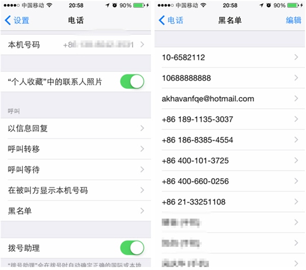 注:所有的黑名單電話均可在“設置-電話”界面裡點擊“黑名單”進入後查看到。