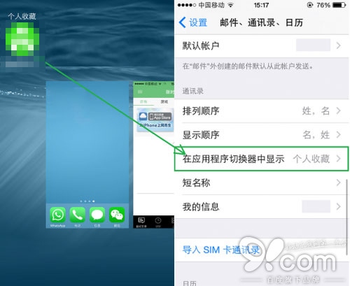 另外,iOS 8在多任務界面的上方,添加了個人收藏和最近聯系人的頭像。如果覺得煩的話,也可以關閉噢~