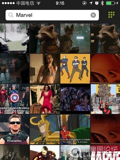 這可能還不夠吸引你。那麼內置的搜索功能又如何?從此互聯網上的海量 GIF 動圖都能收入掌中。來看看我搜索「Marvel」的結果,夠給力吧?