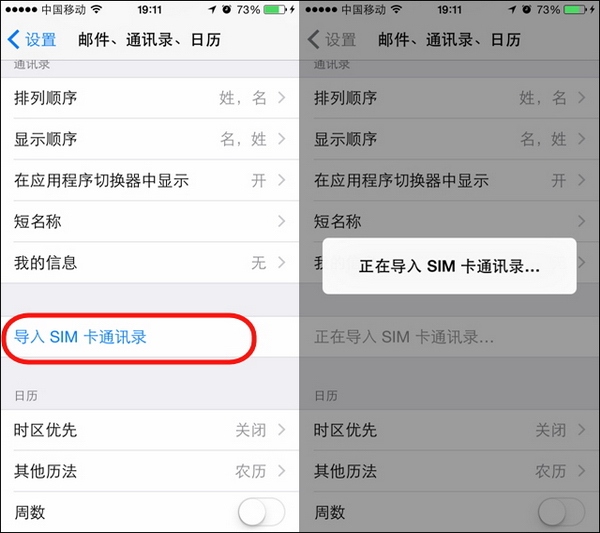 通過上述工具同樣可以實現通訊錄的導入。但在iOS8以及iPhone中,我們更多的時候會采用如下的方法:依次進入“設置-郵件、通訊錄、日歷”界面中,拖動屏幕到下方找到並點擊“導入SIM卡通訊錄”文字鏈接,這樣就可以把原來存儲在SIM卡中的聯系人全部導進來了。