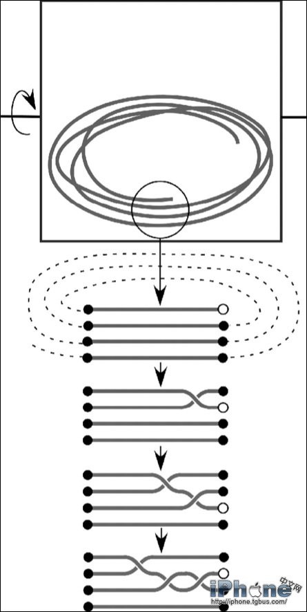 其實,較小的容器是防止打結的最好辦法。實驗發現,較長的繩子在較小的盒子中時,由於繩子有一種展開的趨勢,所以它會緊貼盒子內壁,從而在盒子翻轉時繩子末端不會掉到繩子中段纏繞起來。