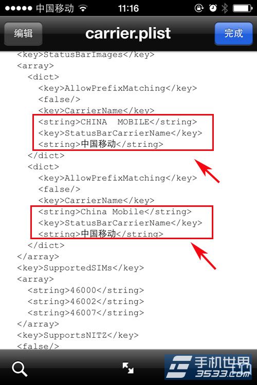 中國移動用戶:大家同樣打開iFile文件,一次打開“System/Library/Carrier Bundles/iPhone/CMCC_co.bundle”然後點擊“carier.plist”文件打開編輯。