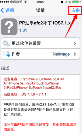 四、找到【PP助手AFC補丁 iOS 7.1.X】,點擊右上角【安裝】: