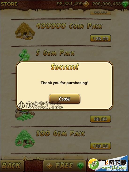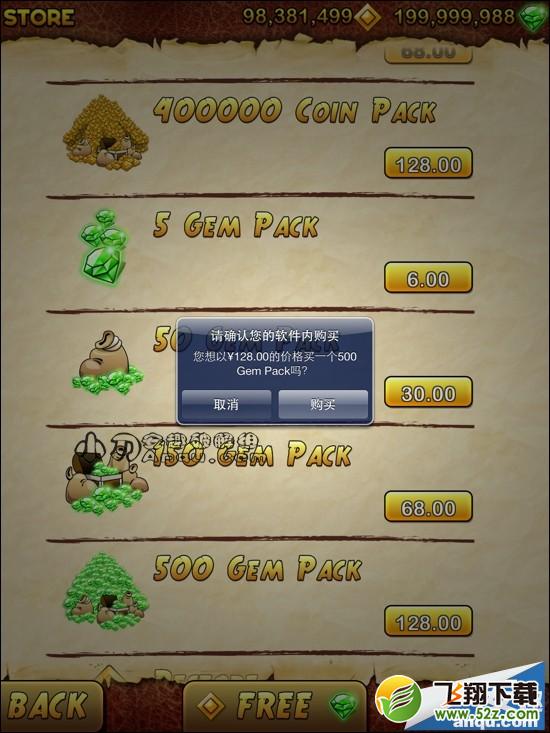 我們以神廟逃亡2這款游戲為例,進行內購,首先進入游戲的商店界面,如下圖,發現有很多使用人民幣購買鑽石的選項,我們直接選擇最貴的,也就是那個128元購買500綠寶石的,點擊購買: