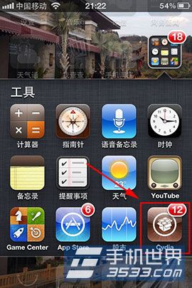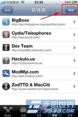1)在已經越獄的主屏上打開“cydia”,點擊“管理”,再點擊“軟件源”