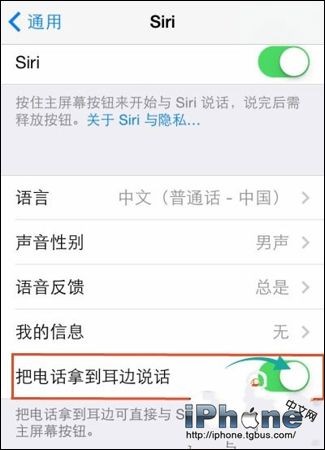 2、在Siri的設置項中,開啟“把電話拿到耳邊說話”選項功能。