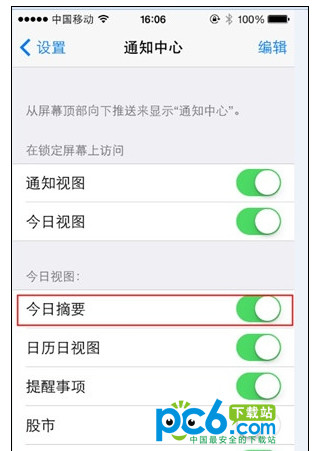 2.如果還是沒顯示的話,大家可以點擊“設置”--“通知中心”--“今日視圖”--“今日摘要”,打開就行了。