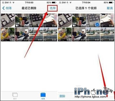 2、然後點擊進入該相薄中,點擊右上方的選擇選項,你便可以選擇想要恢復的照片或視頻,然後再點一下右下方的恢復功能即可。