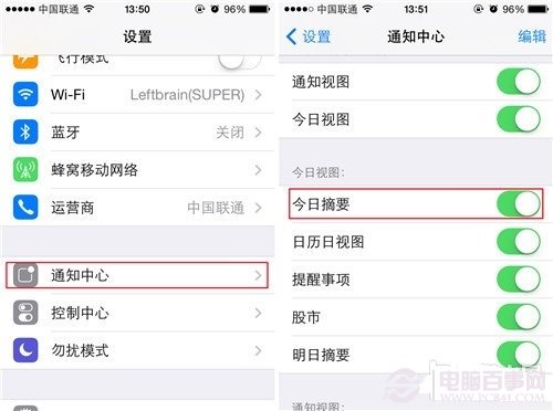 第三步:接下來我們要退回“設置”選項頁面,然後點擊“通知中心”,打開“今日摘要”選項。