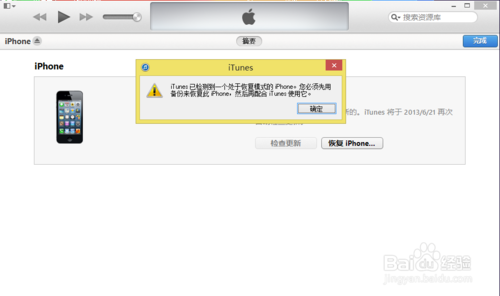 然後我們打開電腦上的 iTunes,接下來軟件會提示我們已檢測到一個處於恢復模式的 iPhone,點擊“確定”按鈕繼續,如圖所示