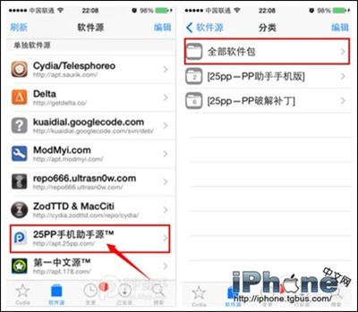 3、添加完畢後在軟件源中找到“25PP手機助手源”,選擇【全部軟件包】;