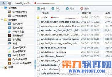 2、接著進入var/lib/apt/list這個文件路徑,刪掉所有東西,當然partial文件夾不要刪除,點開它把裡面東西刪掉。這個時候基本閃退的問題都解決了,但是打開cydia會出現裡面添加的源什麼都沒有了,沒關系,不要慌,重啟手機,軟件源裡面刪掉一個源,再重新添加,之後就好了。