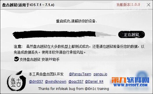 目前盤古只有Windows版,Mac版本還在緊張開發中。盤古1.0支持iOS 7.1-7.1.1的完美越獄,適用設備幾乎是全線設備,從iPad2~iPad Air,從iPhone4~iPhone 5S都能完美支持。