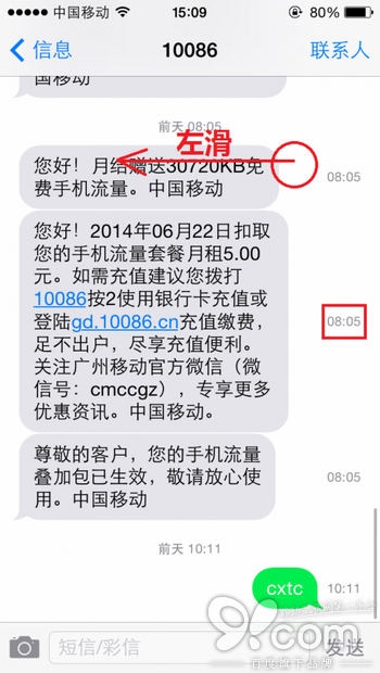 在信息的詳情界面中,只要向左滑動界面,就能夠看到每條信息成功發送時的時間點,非常方便。