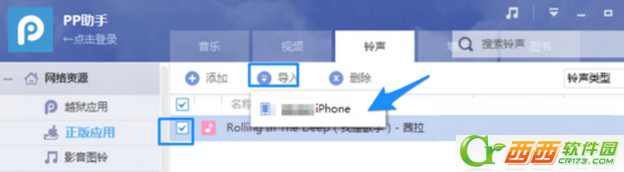 4.接下來我們選中剛剛下載的新鈴聲,再點擊“導入”按鈕,隨後再點擊出現的 iPhone 選項