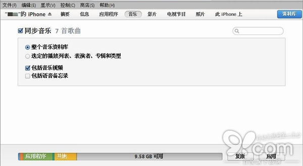 第三步,進行音頻文件同步,同步時,在iPhone設備“音樂”選項頁面,勾選“同步音樂”進行音樂同步。