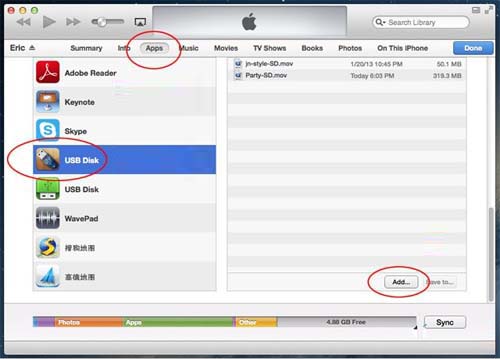 三、點擊“Apps”,然後在下面找到你的USB Disk應用,點擊你的USB Disk應用那個圖標,在右側就顯示U盤裡面的內容,點擊右下腳的"Add",你就可以在電腦硬盤裡面尋找並添加文件。