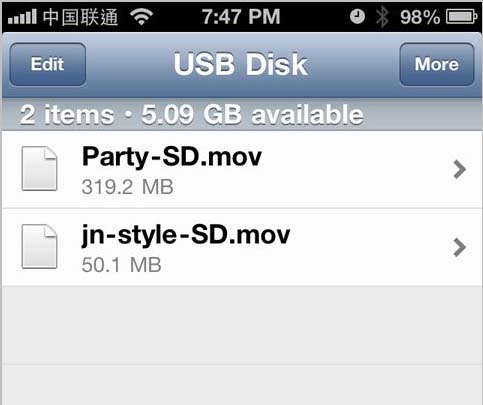 四、打開你iPhone上的USB Disk應用,現在你就可以看見你的文件了,視頻和圖片可以直接點擊播放。