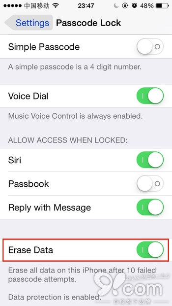 4、最後的隱私防線。(如果你的iPhone經常被別人試密碼,那麼最好還是關了吧,開啟後只有10次機會)