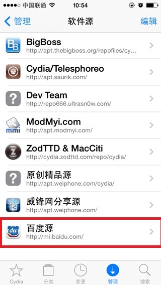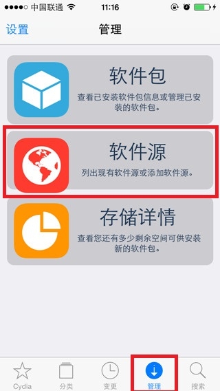 2、進入Cydia之後在下面菜單中找到管理選項。