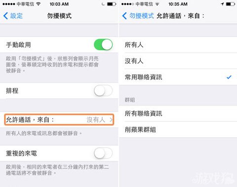 但你可能會碰到「不得不接的電話」,例如深夜女友心情不好打來跟你做心理咨詢,或是老板突然有急事要請你處理,即使再怎麼累也得接的電話,這時就能設定「允許通話」,讓指定聯系人能在勿擾模式下聯絡到你: