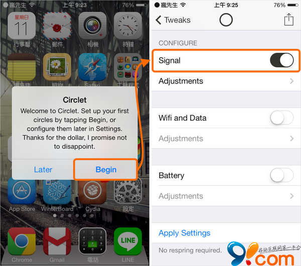 Circlet是一款針對狀態欄三個比較占位置數據圖標:信號、WiFi、電池修改插件。Circlet提供了三種替換方案,分別是餅盤、內填充與內圓點圖標,均是動態形式替換,可根據數據的變化而自動改變形狀。讓你的狀態欄更加簡潔美觀。