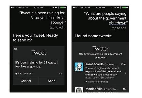 依靠Siri, iOS成為一個精力充沛、有略顯成熟的Twitter”助手“.你可以對Siri說:”寫微博(Tweet): 我剛才好像看到了三只頭的狗抓住了一個飛盤。不現實!“,”寫微博並標注我的地理位置:我的車在底特律出了故障,誰幫幫我?“.